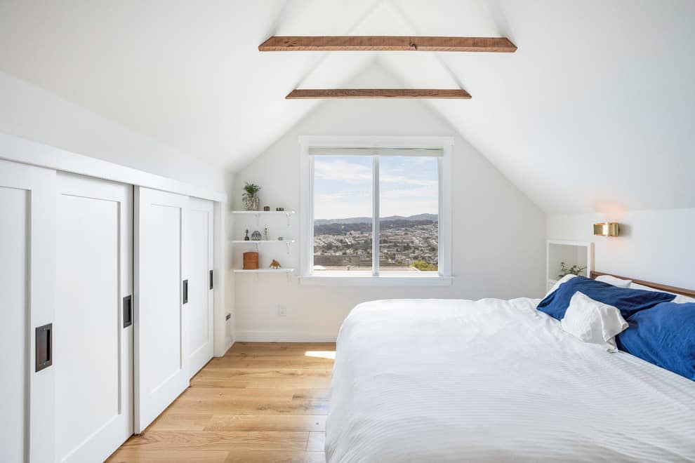 Few things create such a perfectly clean look as an inset slide door. The traditional wood with a white painted finish allows this style to go with just about any interior aesthetic. The shorter doors in this attic room take up the full wall and provide lots of storage space that would otherwise go unused.
